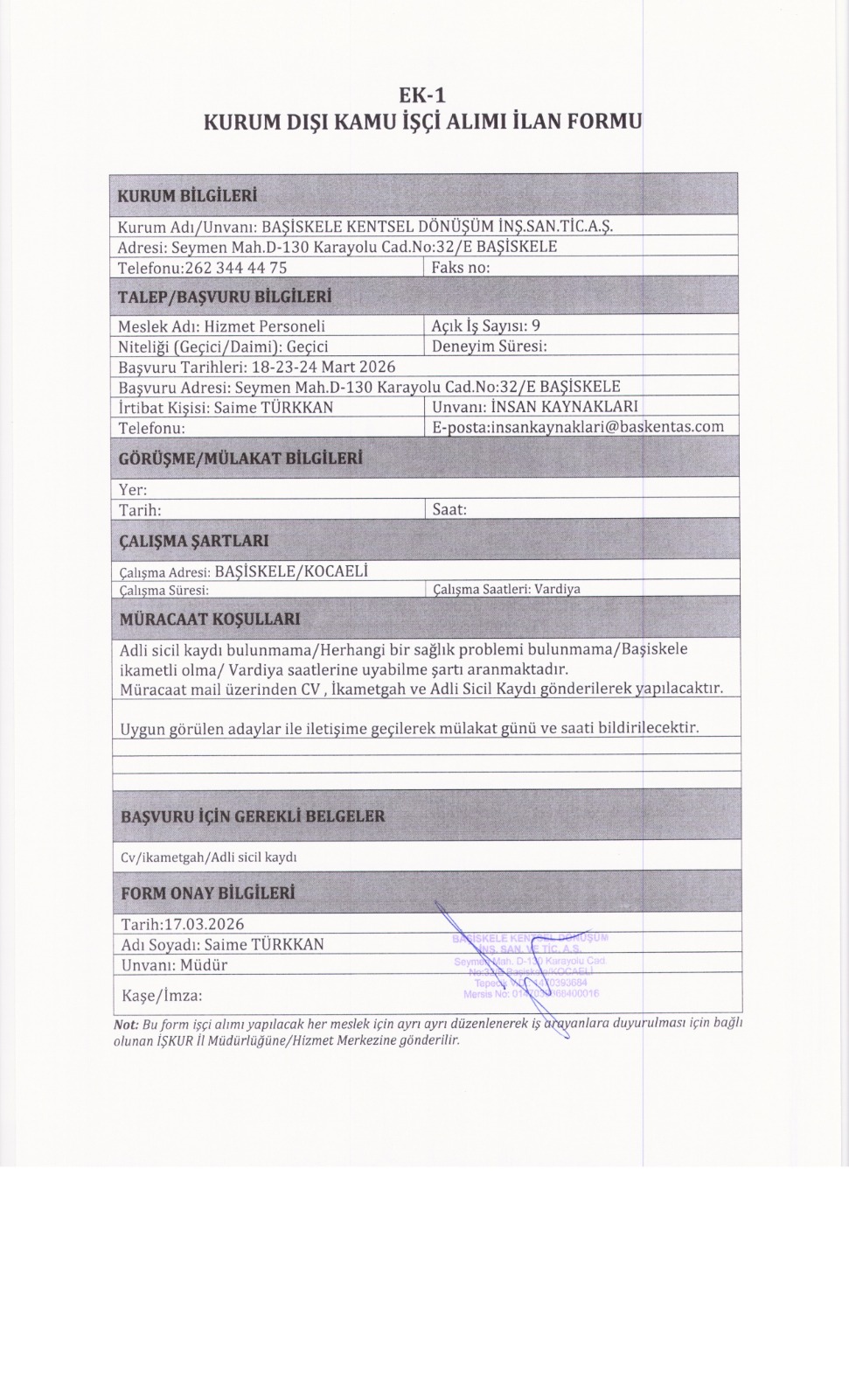 Not: Bu ilan İŞKUR Kurum Dışı İşçi Alım sayfasından otomatik olarak çekilmiştir. En güncel ve doğru bilgi için resmi ilan dosyasını kontrol ediniz.